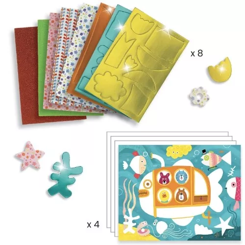 Iedere mozaïekplaat bevat witte vlakken die kinderen op kunnen vullen met zelfklevende glitter-, vilt- of metallicstukjes. Zo ontstaan schilderijen waarop altijd iets nieuws te ontdekken valt. Alle stukjes zijn voorgevormd zodat kinderen meteen aan de slag kunnen.