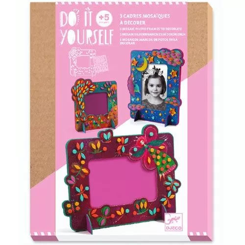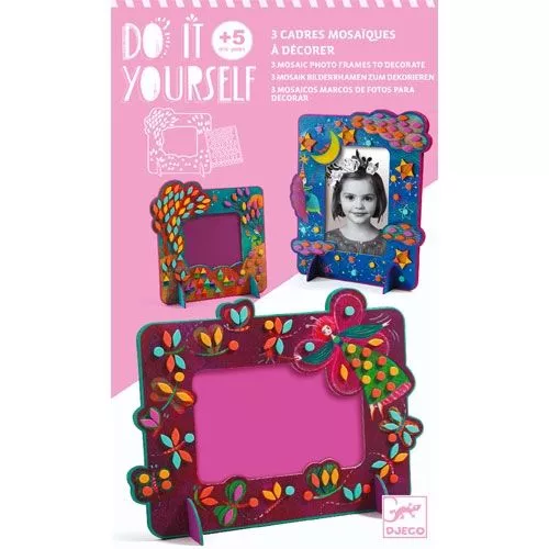 ‘DIY Mosaics Frames – Fairy-like’ van het Franse merk Djeco is een knutselset om jonge kinderen kennis te laten maken met mozaïek, op basis van zelfklevende onderdelen. Het kind speelt met vormen, materialen en kleuren om drie geweldige fotolijsten te maken.