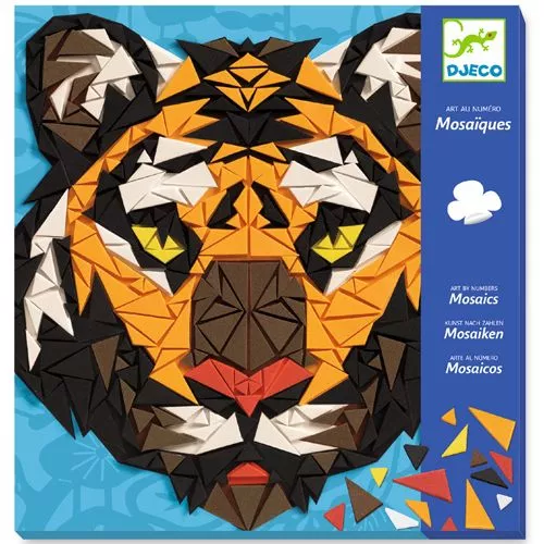 Deze ‘Kunst op nummer’ inlegset Khan van het Franse merk Djeco laat de 2 imponerende wilde dieren schitteren met mozaïek stukjes.