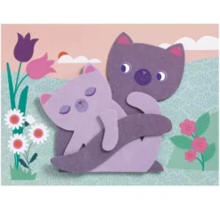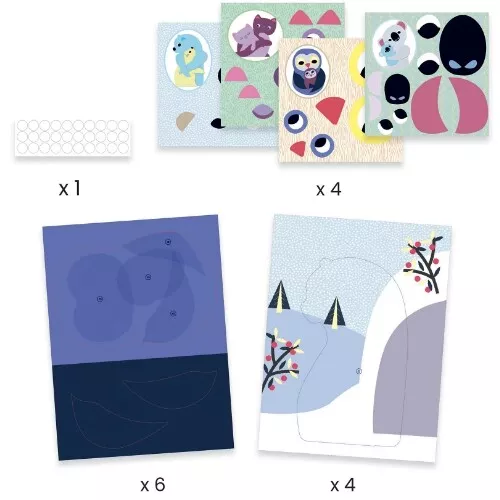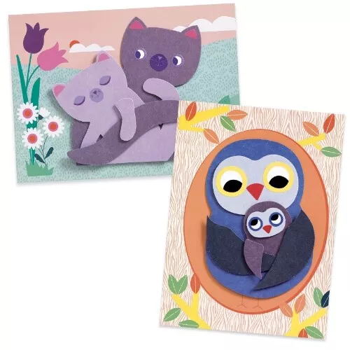 Door de stukken papier over elkaar heen te plakken ontstaan vertederende dierenschilderijtjes.