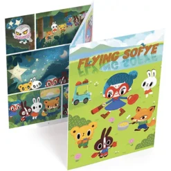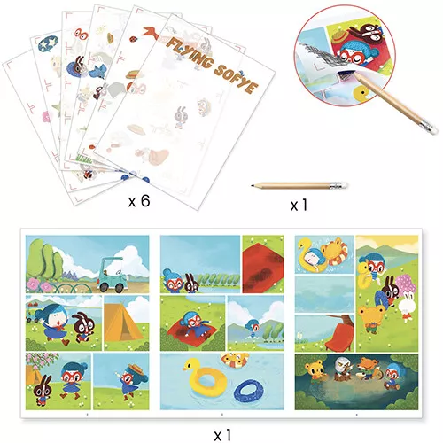 Kinderen zijn zelf de auteur van het stripverhaal ‘Flying Sofye’ met het knutselpakket Comics Transfers van het Franse merk Djeco. De innemende personages worden met behulp van stickers in het opvouwbare accordeonboek geplaatst door over de afbeelding te wrijven met het potlood.