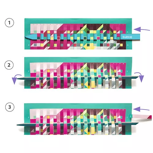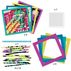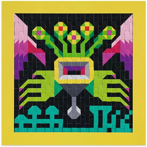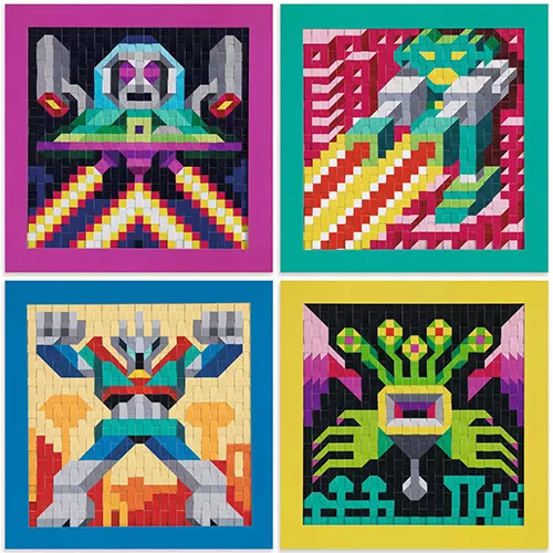 Een buitenaardse knutselset ‘Invaders’ van het Franse merk Djeco waarmee kinderen met stroken papier vier ‘pixel art’-stijl schilderijtjes weven.