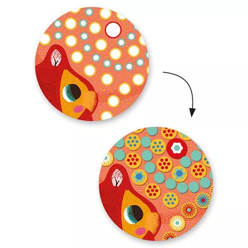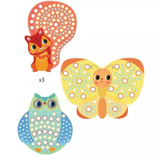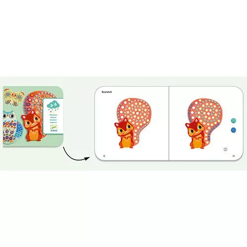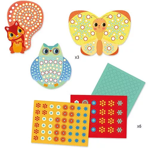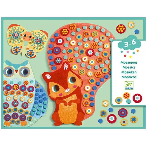 Een knutselsetje van het Franse merk Djeco om jonge kinderen kennis te laten maken met mozaïek, op basis van zelfklevende onderdelen. Het kind speelt met vormen, materialen en kleuren om drie prachtige, ontroerende kunstwerken te maken.