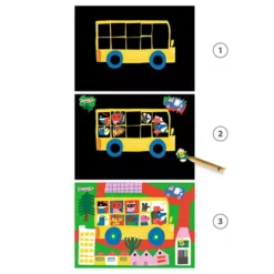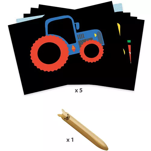 Kras voorzichtig de zwarte laag weg om kleurrijke voertuigen en dierenvriendjes tevoorschijn te toveren.Ā