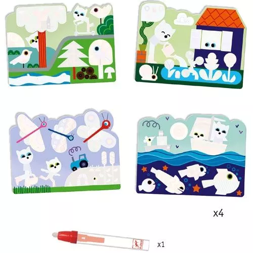 De kleurset bestaat uit vier stevige kleurkaarten en een stift die kan toveren als hij gevuld is met water. Als de kleurplaten weer droog zijn, kunnen ze opnieuw ingekleurd worden.