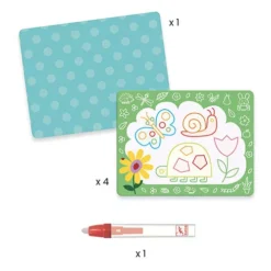 De kleurset bestaat uit vier stevige kleurkaarten, een stift die kan toveren als hij gevuld is met water en een kartonnen standaard voor de kaarten. Als de kleurplaten weer droog zijn, kunnen ze opnieuw ingekleurd worden.