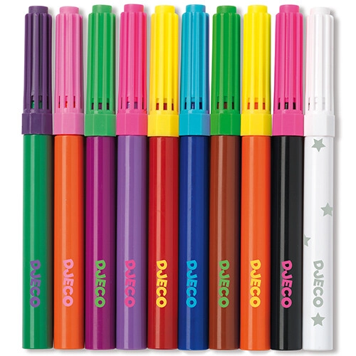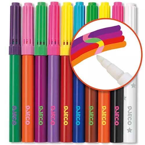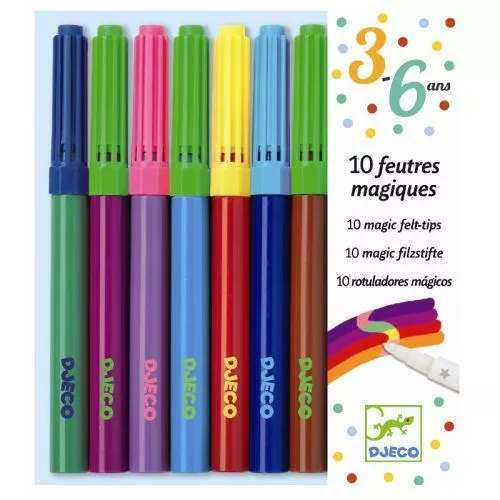 Een set van 10 magische viltstiften van Djeco voor verrassende effecten! Deze leuke toverstiften veranderen van kleur wanneer je er met de witte stift overeen gaat. Zo wordt de zwarte stift roze, en de bruine stift groen! De kleur van de dop komt overeen met de kleur waarin de stiften zullen veranderen.