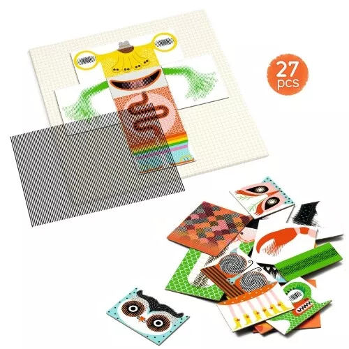 Door verschillende magneten – een hoofd, een arm, een torso – op het magneetbord te plaatsen ontstaan fantasierijke monsters. Leg vervolgens een van de twee gestreepte kijkkaarten over de monsters om grappige special effects te zien.