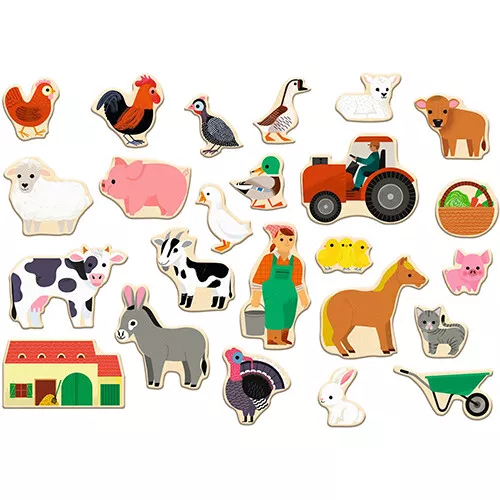 Koeien, schapen, geiten… Leer alle boerderijdieren kennen en verzin mooie verhalen met deze set van 24 houten magneten ‘Farmix’ van het Franse merk Djeco.