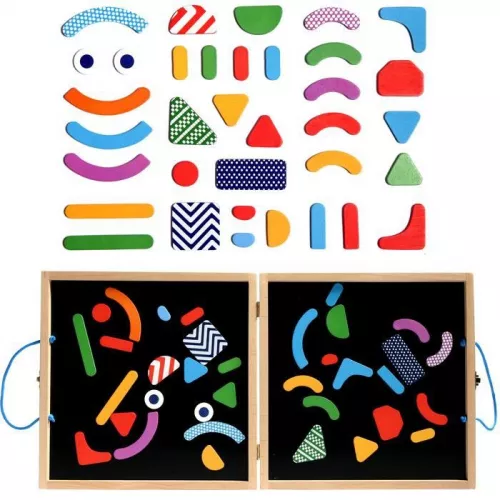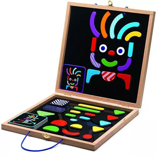 Een houten magneetkoffer van het Franse merk Djeco. Stel met de geometrische vormen zelf bedachte figuren samen of reconstrueer de voorbeeldkaarten.