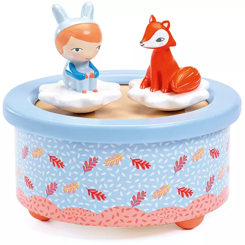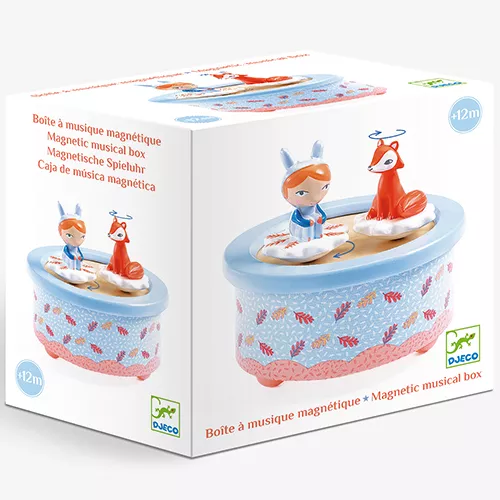 Een opwindbaar muziekdoosje met een dansende jongen en vos van het Franse merk Djeco. De poppetjes worden aangestuurd door de bewegende magneet en dansen zo rondjes. Met de melodie van het Wiegenlied van Schubert.