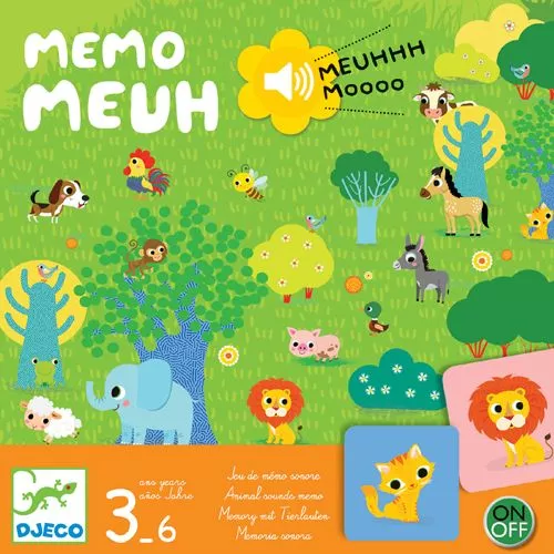 Een memoriespel met geluid ‘Memo Meuh’ van het Franse merk Djeco met dieren als thema Een grappig kinderspel waarbij je op een gele knop moet drukken en goed moet luisteren om een dierengeluid te herkennen. Daarna zoek je het dier tussen de kaarten.