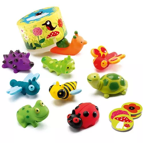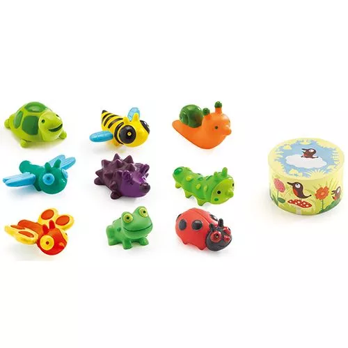 – 9 beestjes (vlinder, lieveheersbeestje, bij, slak, egel, kikker, schildpad, libelle, rups)