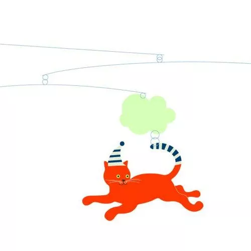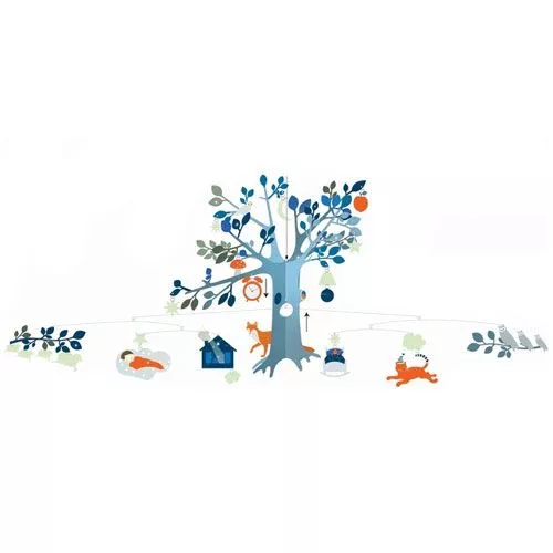 De mobiel bestaat uit zo’n 20 bijzonder geïllustreerde hangers. Een groene boom met verschillende hangers hangen vrolijk in de lucht.