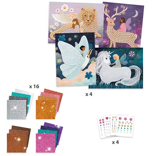 De knutselset bestaat uit vier mooi geïllustreerde platen van Kendra Binney, met een meisje en dieren in het bos, die ingevuld kunnen worden met zelfklevende stickertjes met glitters.
