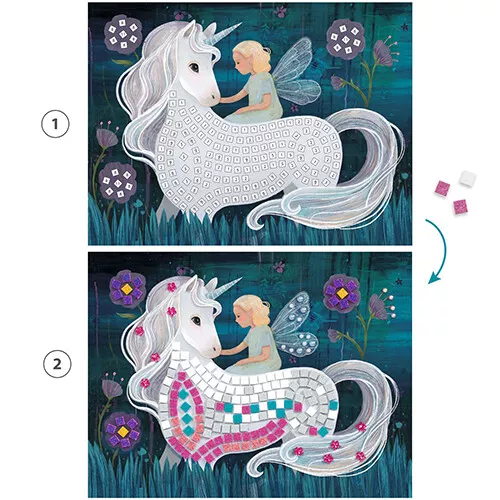 Laat de betoverende schilderijtjes schitteren met deze mozaïek op nummer ‘Mosaics – The enchanted world’ van het Franse merk Djeco.