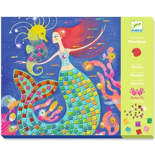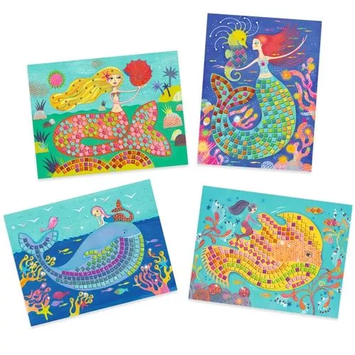 Deze ‘kunst op nummer’ inlegset van het Franse merk Djeco laat de zeemeerminnen prachtig schitteren met mozaïek mousse.