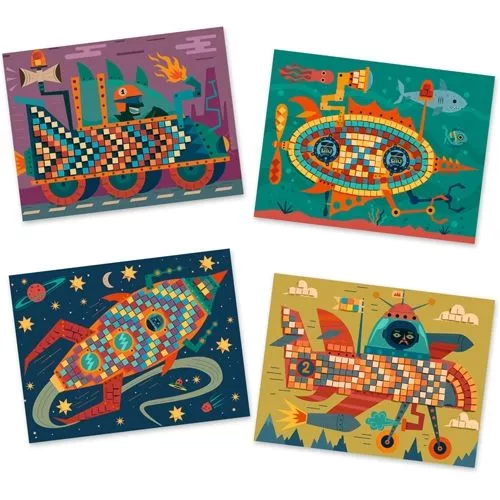 De zelfklevende schuimvierkantjes zoeken een plekje op de fantasierijke voertuigen. Elke kleur heeft een nummer: zoek, match en plak. Of maak je eigen combinatie van kleuren.