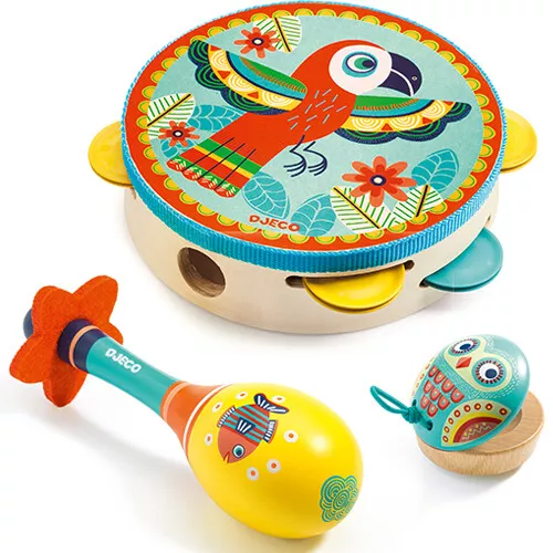 Met deze vrolijke houten muziekinstrumenten van het Franse merk Djeco kunnen peuters met drie verschillende speelgoedinstrumenten muziek maken.