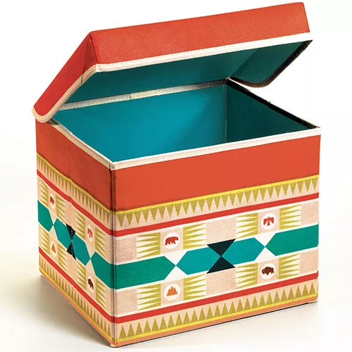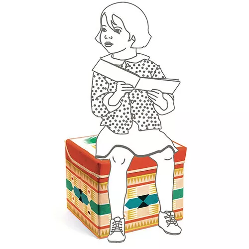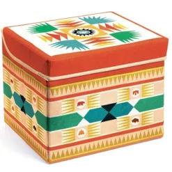 Een gekleurde opbergdoos ‘Teepee’ van het Franse merk Djeco, die ook als kinderkrukje gebruikt kan worden. Om op te zitten én speelgoed in op te bergen!
