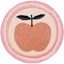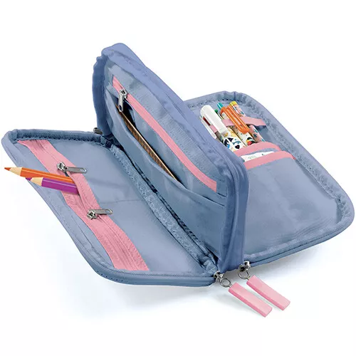 Het kinderetui met een geborduurd embleem van een appel heeft twee grote compartimenten die elk sluiten met een rits. Opengevouwen heeft het een apart vak. Aan de binnenkant is elk vak voorzien van vier zijvakjes.