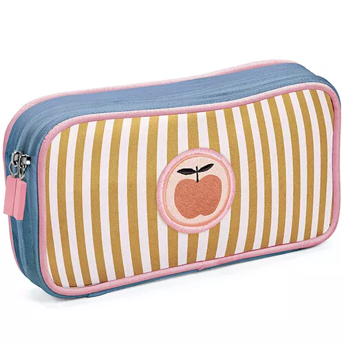 In deze vrolijke gestreepte pennenetui met twee vakken en een binnenvak ‘Apple’ van het Franse merk Djeco zijn pennen, potloden en gummetjes geordend te bewaren.