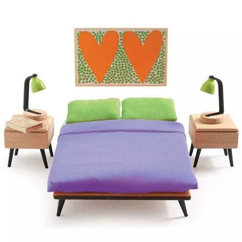 Een uitgebreide master bedroomset van het Franse merk Djeco voor de grote slaapkamer van het poppenhuis. Het speelgoed meubelsetje bestaat uit een twee persoonsbed met een matras, hoeslaken en twee kussens, twee nachtkastjes met twee nachtlampen, een schilderij, een wekker en een boek.