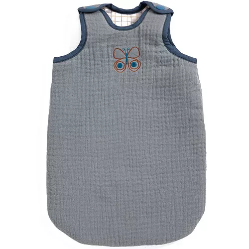 Een katoenen poppentrappelzak ‘Sea Green’ van het Franse merk Djeco. De poppenslaapzak met een geborduurd vogeltje op de voorkant is gewatteerd zodat de babypop comfortabel kan slapen.