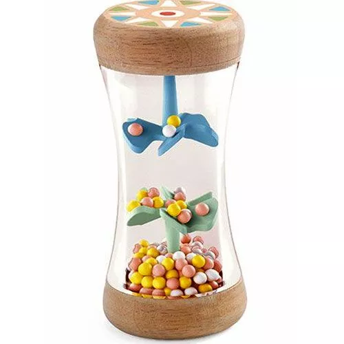 Rammelaar ‘BabyPlui’ is een kleine rain shaker van het Franse merk Djeco in naturel hout en blauwgroene tinten. Het simpele ontwerp in pastelkleuren met kleine kleurige balletjes, nodigt de baby uit tot spelen en onderzoeken.