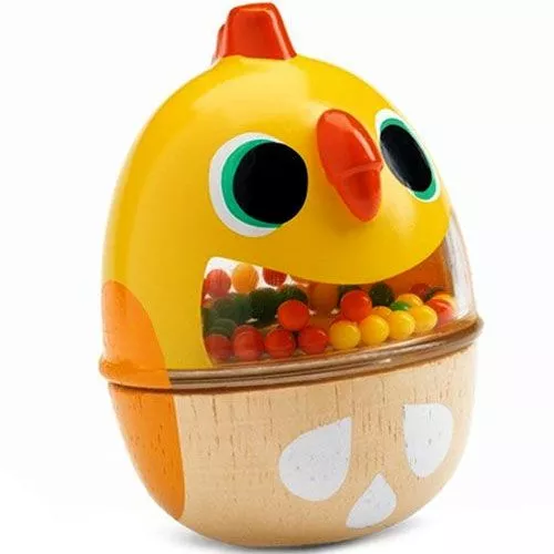 De kleurige rammelaar ‘Piticot’ van het Franse merk Djeco ziet eruit als een ondeugend kuikentje en maakt een helder ritselend geluid. Schudden maar!