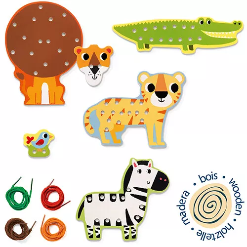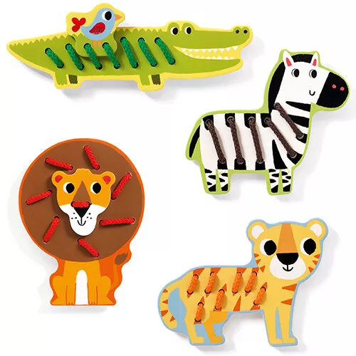 De peuterset bestaat uit 4 houten rijgkaarten met afbeeldingen van vrolijke wilde dieren en 4 gekleurde rijgveters van 100 cm lang.