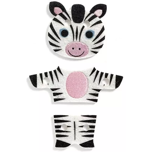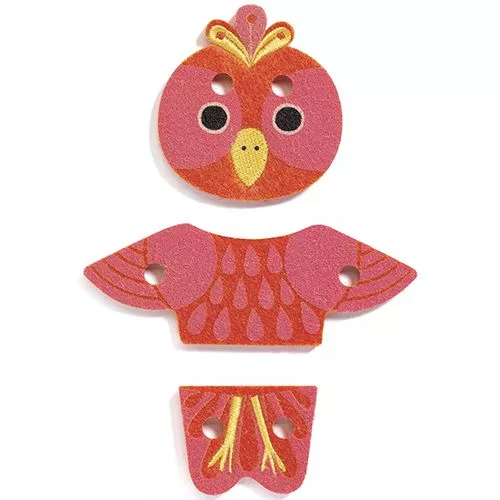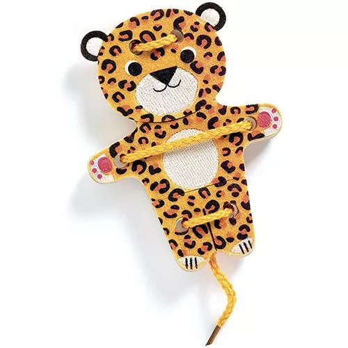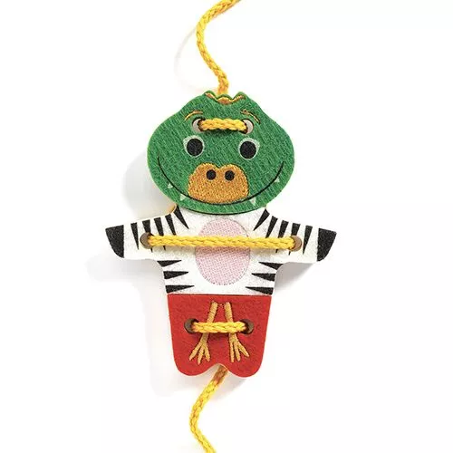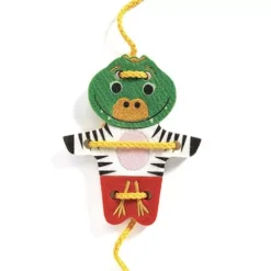 Leer rijgen met deze creatieve set ‘Feltimix’ van het Franse merk Djeco. Met behulp van het houten gereedschap kunnen kinderen een vilten krokodil, zebra, luipaard en papegaai rijgen, maar ook nieuwe, gekke dieren maken.