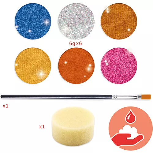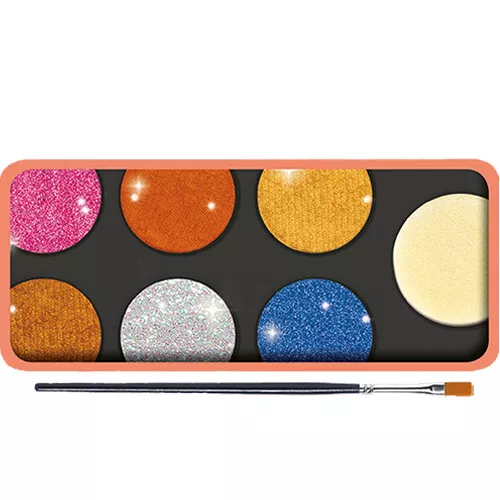 Het doosje bevat een penseeltje, een sponsje en 6 metallic kleuren; goud, zilver, brons, oranje, roze en blauw.