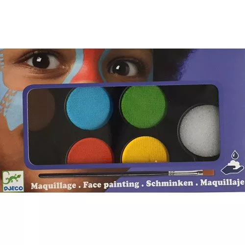 Een schminkset van het Franse merk Djeco. De schminkset bestaat uit een 6 kleuren schmink: blauw, groen, rood, geel, bruin en zwart, een penseeltje en een klein sponsje.