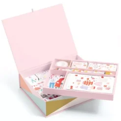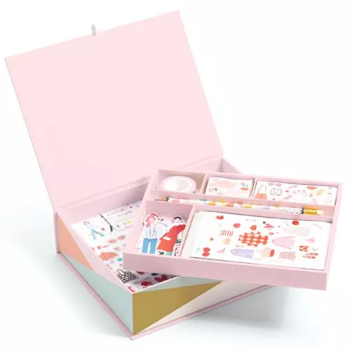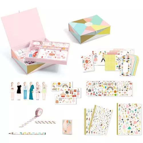 Een mooie schrijfset ‘Tinou’ van het Franse merk Djeco met het fashion-thema in pastelkleuren. Een complete kinderschrijfset met schriftjes, notitieboekjes en kaarten om te versieren met stickers en wrijfplaatjes. En ga zo maar door!