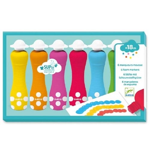 Een set met 6 foamstiften van het Franse merk Djeco voor de beginnende kunstenaar. De speciale vorm zorgt ervoor dat de stiften makkelijk vastgehouden kunnen worden door jonge kinderen. Afsluitbaar met een dop om uitdroging tegen te gaan. Deze schuimmarkers maken het een feest om te stempelen!