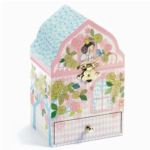 Een prachtig sieradendoosje met muziek ‘Palais enchanté’ van het Franse merk Djeco in de vorm van een klein paleisje met blauwgroene bomen, blauw dak en een prinses in het raampje.