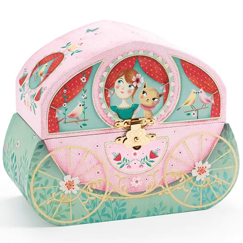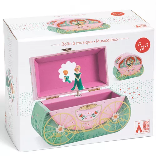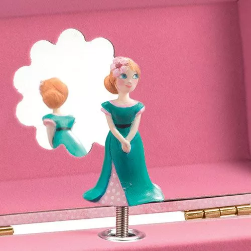 Een sierlijk sieradendoosje met muziek van het Franse merk Djeco. Dit prachtige muziekdoosje heeft een hoofdvak met een spiegel en een ronddraaiende prinses.