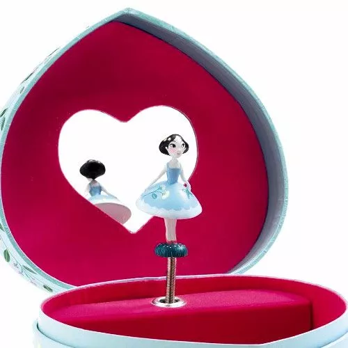 Een prachtig sieradendoosje met muziek ‘Danseuse en herbe’ van het Franse merk Djeco in de vorm van een hart. Dit mooie mintgroene muziekdoosje is versierd met bloemen, vogels, en vlinders, met in het midden een prinses en een vogeltje.