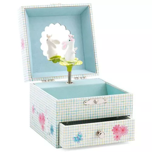 Een vrolijk sieradendoosje met muziek van het Franse merk Djeco. Dit prachtige muziekdoosje heeft een hoofdvak met een spiegel, een lade en natuurlijk een ronddraaiend poppetje. Het lieve konijn draait rond op zijn favoriete liedje: ‘Let Me Call You Sweetheart’ van Leo Friedman. Dans jij met hem mee?