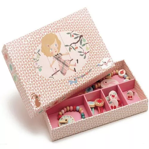 Een elegant sieradendoosje met een set houten kindersieraden Zomerse Tuin van het merk Djeco. De sieraden zijn versierd met zomerse motieven van bloemen, vlinders en vogeltjes, passend in het roze kinderjuwelendoosje met aparte vakjes. Het armbandje heeft een rond klokje met wijzertjes.