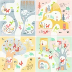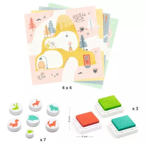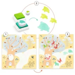 Een stempelset vol vrolijke bosdieren in verschillende landschapjes ‘Out and About’ van het Franse merk Djeco.