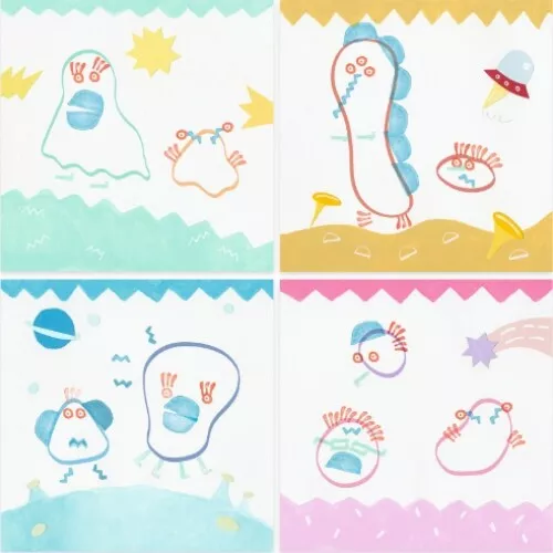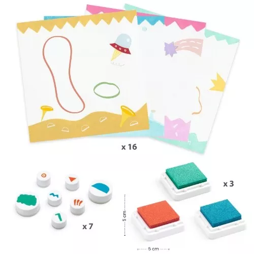 Creëer met behulp van de alienstempels verschillende taferelen op de bijgeleverde stempelkaarten. Kinderen kunnen de stempels op verschillende manieren combineren en hun fantasie de vrije loop laten. Zo ontstaan fantasierijke kaarten.