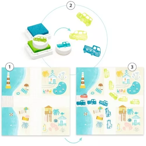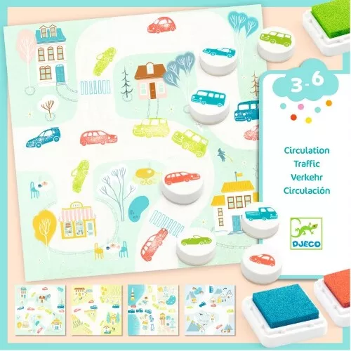 Een stempelset met auto’s in verschillende situaties ‘Traffic’ van het Franse merk Djeco.