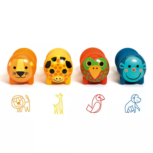 Een stempelset ‘Stamps for little ones – Safari animals’ van het Franse merk Djeco met vier ergonomische peuterstempels van safaridieren.