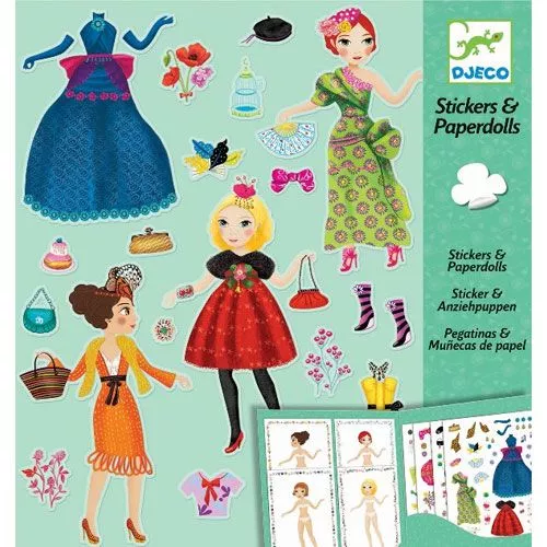 Een papieren, modieuze kaft van het merk Djeco met acht kaarten om modellen aan te kleden met talloze kledingstukken en accessoires. De verwijderbare stickers zijn keer op keer te gebruiken!