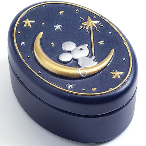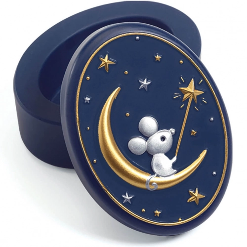 Het tandendoosje heeft zilver- en goudkleurige details. Op de bovenkant staat een lief tafereel van een muis met toverstaf op de maan.
