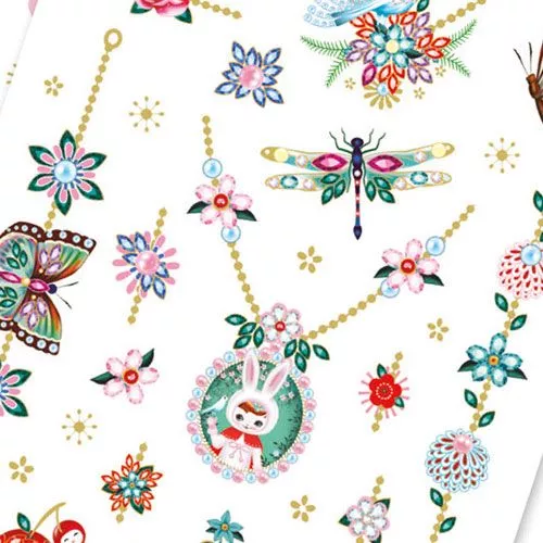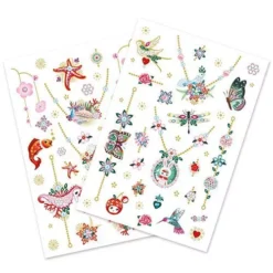 Prachtige kindertatoeages van sieraden van het merk Djeco. De 2 stickervellen van 21×14 cm staan vol met verschillende soorten sieraden, klaar om de huid te versieren. De sieraden moeten alleen even uitgeknipt worden, en dan zijn ze klaar om aangebracht te worden.