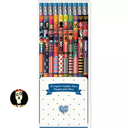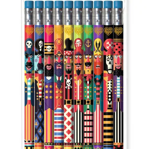 De tekenpotloden zijn versierd met illustraties uit het piratenleven