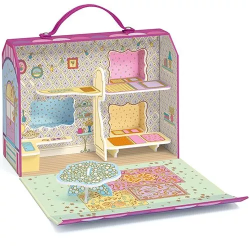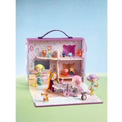 Een draagbaar poppenhuis ‘Bluchka & Indie House’ voor de speelgoedfiguurtjes uit de Tinyly serie van het Franse merk Djeco. Met vier kamers en een uitklapbare woonkamer hebben bewoners Bluchka en Indie genoeg ruimte om bezoek van andere Tinyly popjes en hun dierenvriendjes te ontvangen.